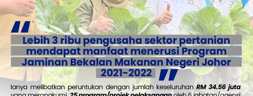 “Antara inisiatif yang menjadi fokus utama ialah pelaksanaan projek di bawah Program Jaminan Bekalan Makanan Negeri Johor menerusi peruntukan daripada Kementerian Kewangan Malaysia iaitu Program Pelan Jana Semula Ekonomi Negara (PENJANA) sebanyak RM34.56 juta bagi tempoh 2021-2022.