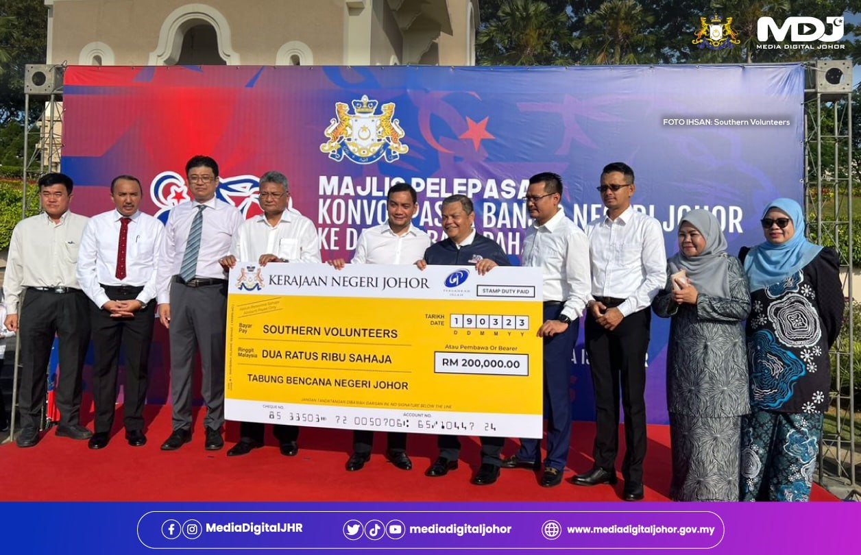 Menteri Besar Johor, Datuk Onn Hafiz turut menyampaikan sumbangan sebanyak RM200,000 dari Tabung Bencana Negeri Johor kepada Southern Volunteers (SV) pada Majlis Pelepasan Konvoi Misi Pasca Banjir SV ke Batu Pahat di Dataran Mahkota, Kota Iskandar, Iskandar Puteri | Gambar Ihsan Southern Volunteers.