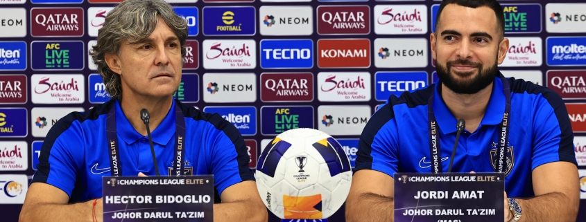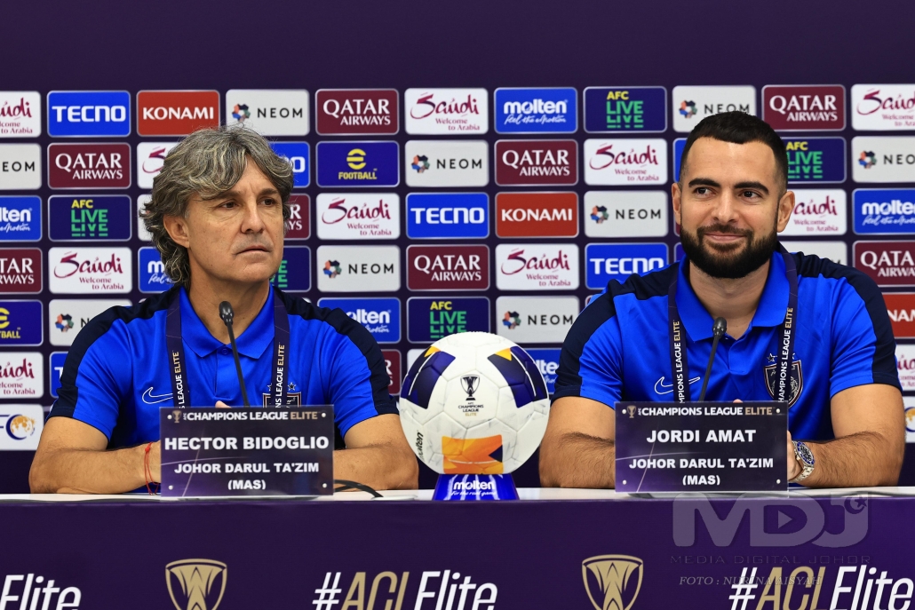 Ketua jurulatih JDT, Hector Bidoglio dan wakil pemain JDT, Jordi Amat di sidang media pra perlawanan Liga Juara-Juara AFC Elit (ACLE) 2024/25. | Foto MDJ Nurina Aisyah