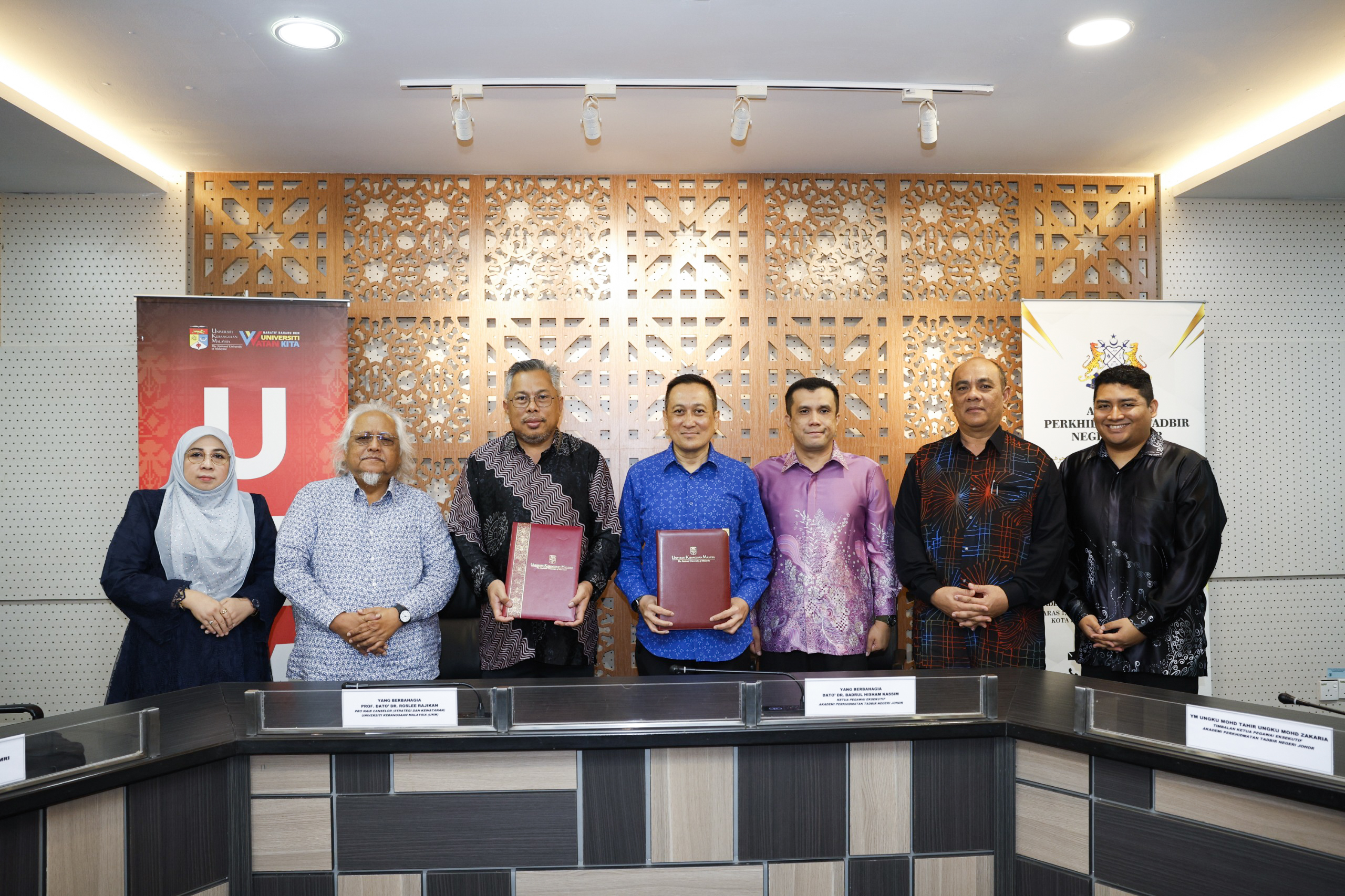 Majlis menandatangani MoU telah disempurnakan oleh YB Dato’ Dr. Haji Badrul Hisham Kassim, Ketua Pegawai Eksekutif APTNJ dan Ybhg. Prof. Dato’ Dr. Roslee Rajikan, Pro Naib Canselor (Strategi dan Kewatanan), diiringi oleh YM Ungku Mohd Tahir Ungku Mohd Zakaria, Timbalan Ketua Pegawai Eksekutif APTNJ dan Prof. Ulung Datuk Dr. Shamsul Amri Baharuddin, Pengarah Pengasas KITA-UKM.