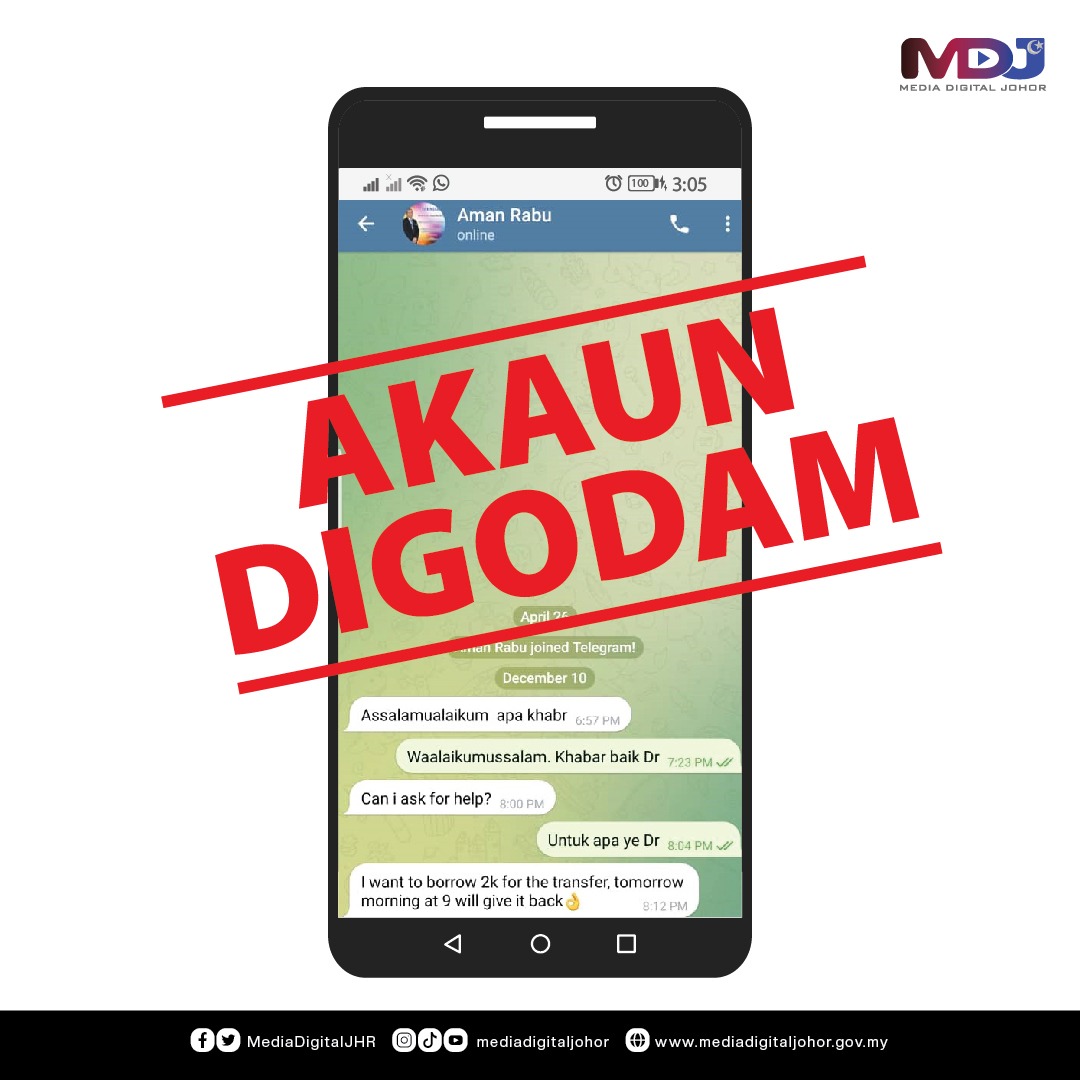 “Sila abaikan permintaan daripada akaun Telegram saya. Dikhuatiri dan dimaklumkan bahawa akaun Telegram saya telah digodam (hacked). Harap maaf dan ambil maklum,” katanya ringkas kepada Media Digital Johor, sebentar tadi.