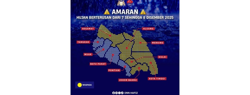 #IskandarPuteri – Jabatan Meteorologi Malaysia (MET Malaysia) hari ini mengeluarkan amaran hujan berterusan (Waspada) serta angin kencang dan laut bergelora yang dijangka melanda beberapa daerah di Negeri Johor bermula pada 7 hingga 8 Disember ini.