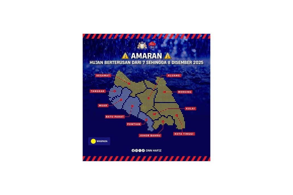 #IskandarPuteri – Jabatan Meteorologi Malaysia (MET Malaysia) hari ini mengeluarkan amaran hujan berterusan (Waspada) serta angin kencang dan laut bergelora yang dijangka melanda beberapa daerah di Negeri Johor bermula pada 7 hingga 8 Disember ini.