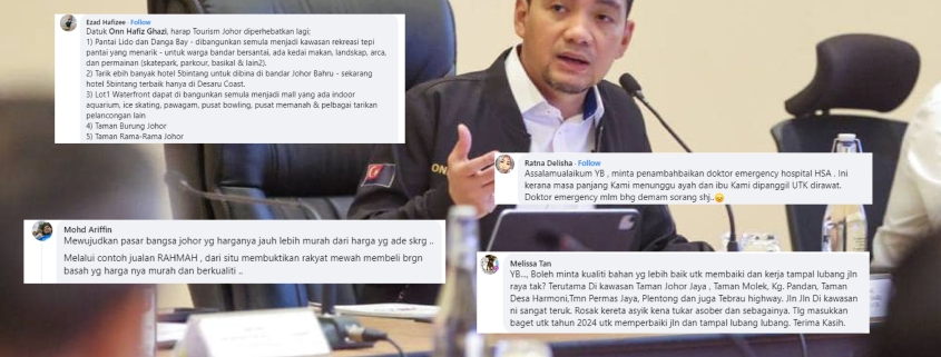 Tinjauan ke atas laman Facebook Menteri Besar, Datuk Onn Hafiz Ghazi mendapati terdapat netizen berkongsikan suara hati masing-masing untuk Belanjawan Johor 2024 meliputi pelbagai sektor.