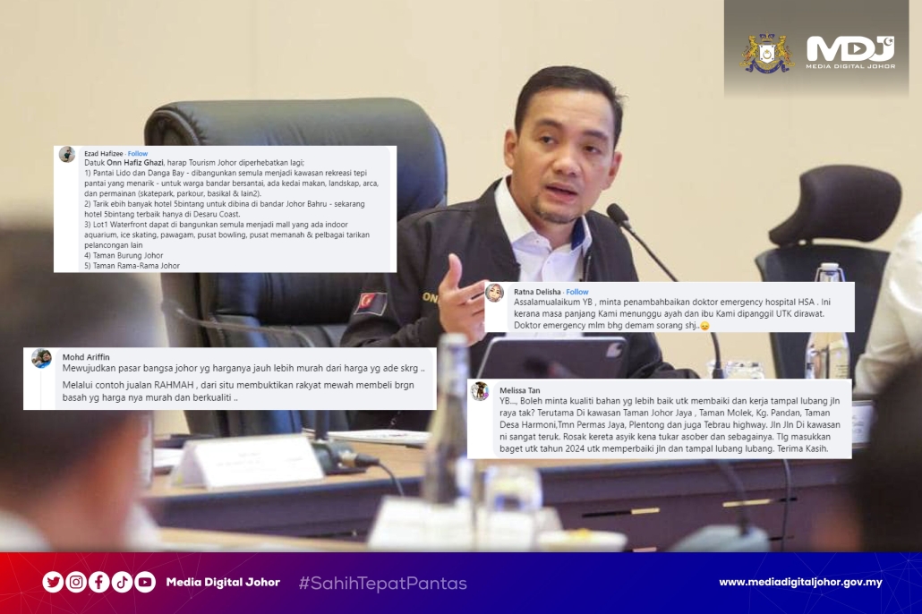 Tinjauan ke atas laman Facebook Menteri Besar, Datuk Onn Hafiz Ghazi mendapati terdapat netizen berkongsikan suara hati masing-masing untuk Belanjawan Johor 2024 meliputi pelbagai sektor.