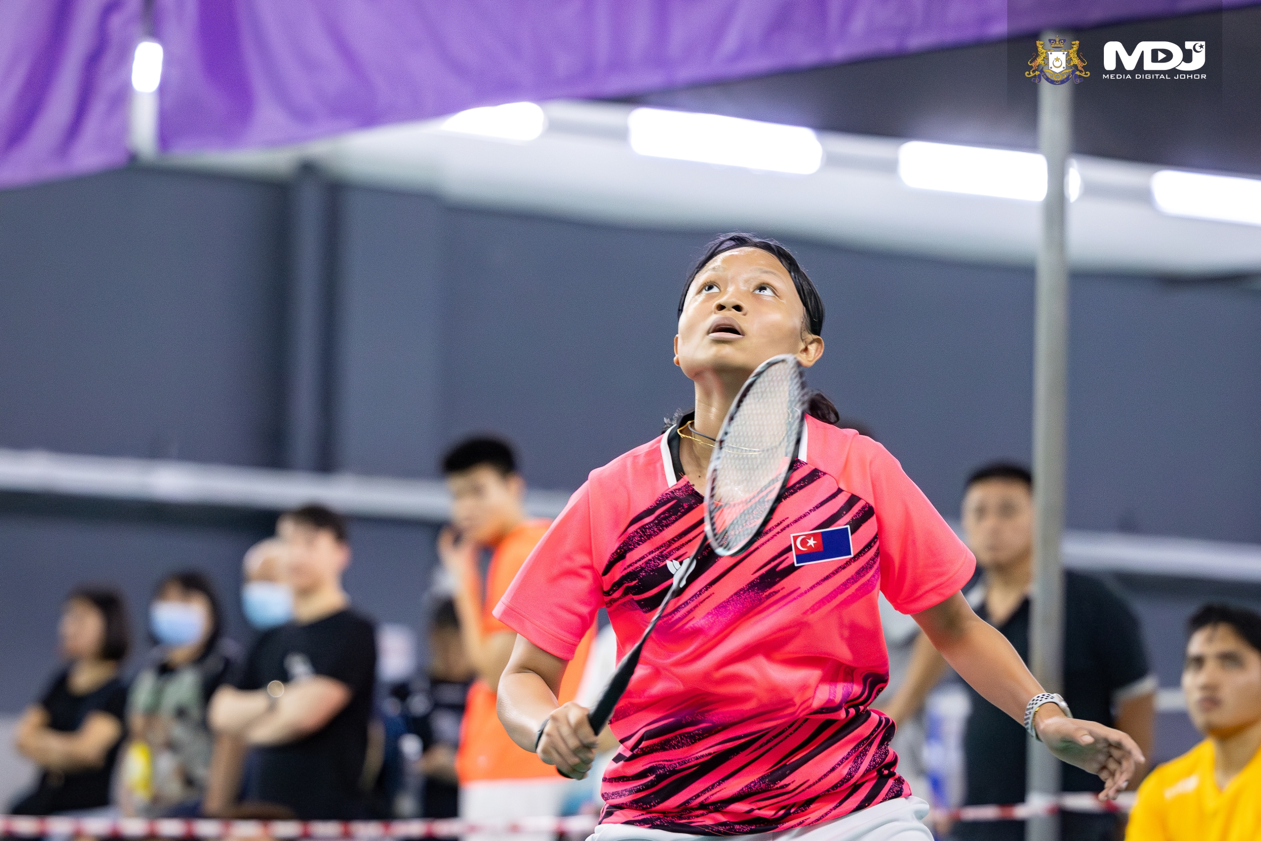 Pemain perseorangan wanita muda negara, Dania Sofea Zaidi, 16, menepati ramalan apabila muncul juara kategori perempuan Bawah 17 Tahun, Kejohanan Badminton Remaja Tertutup Johor 2023. | Foto MDJ, Nurina Aisyah