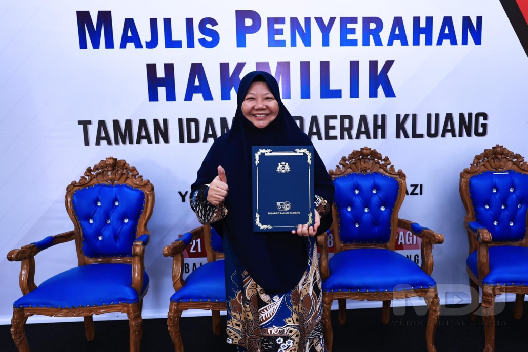 Rositah Othman, 59, Guru Besar Sekolah Rendah Agama Bersepadu Kluang, meluahkan kegembiraannya apabila setelah menerima geran hak milik dibelinya yang diserahkan oleh YAB Dato’ Onn Hafiz Ghazi, Menteri Besar Johor.