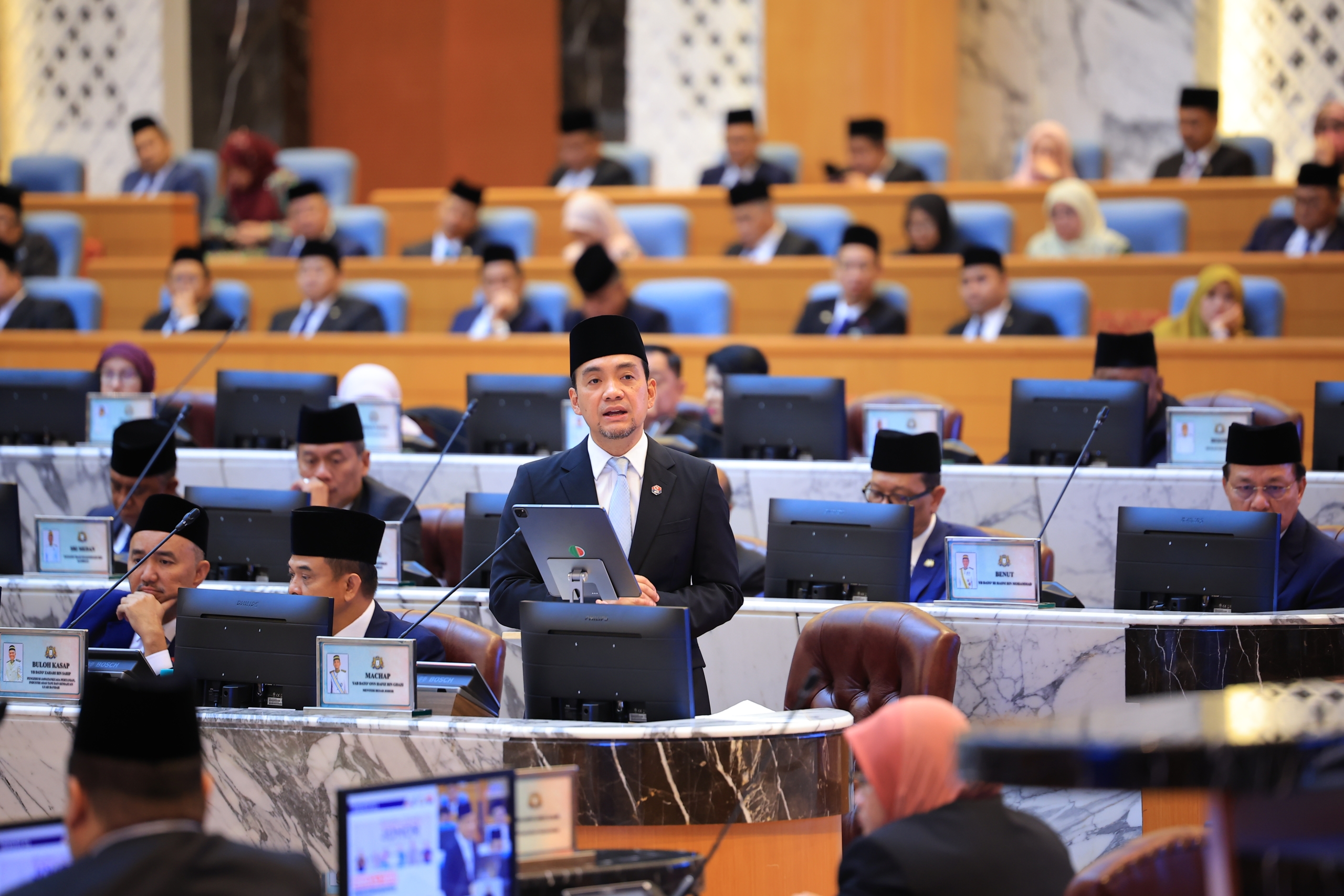 Terdahulu, YAB Dato’ Onn Hafiz Ghazi, Menteri Besar Johor membentangkan Belanjawan Johor 2026 bertemakan ‘Bangsa Johor Sejahtera’ pada Mesyuarat Ketiga (Belanjawan 2026) bagi Penggal Persidangan Keempat Dewan Negeri Johor Ke-15 di Bangunan Sultan Ismail, Kota Iskandar, hari ini.