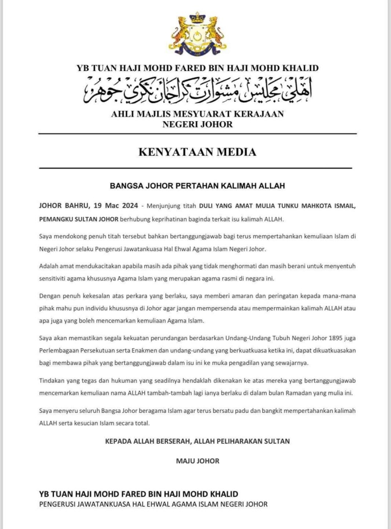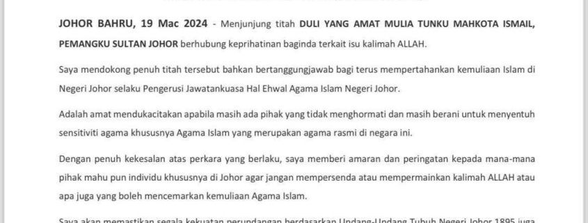 Kerajaan Johor menjunjung dan mendukung penuh titah Duli Yang Amat Mulia Tunku Mahkota Ismail, Pemangku Sultan Johor atas keprihatinan terhadap isu kalimah Allah serta bertanggungjawab akan terus mempertahankan kemuliaan Islam di negeri ini.