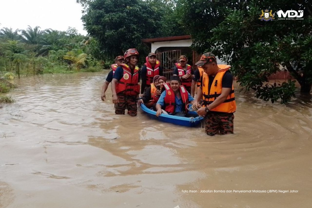 Anggota bomba menyelamat dan memindahkan warga emas ke Pusat Pemindahan Sementara (PPS). | Foto ihsan Jabatan Bomba dan Penyelamat Malaysia (JBPM) Negeri Johor
