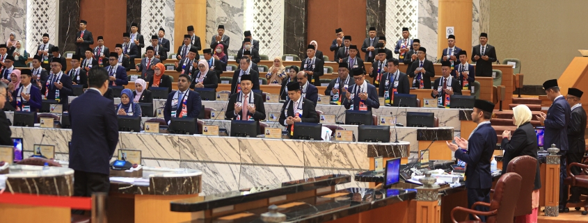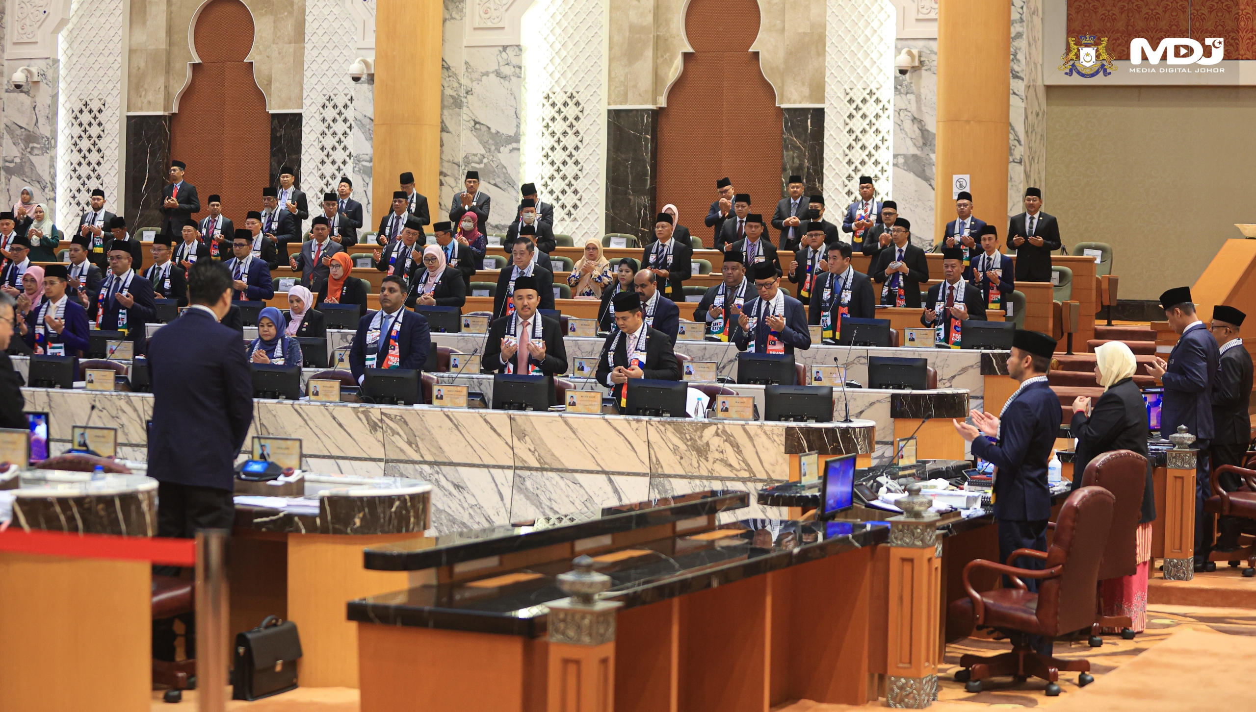 Dewan Negeri Johor menzahirkan solidariti kepada Palestin dengan memakai mafela khas tertera ‘Free Palestin dan Save Gaza’. | Foto MDJ Wira Anggara