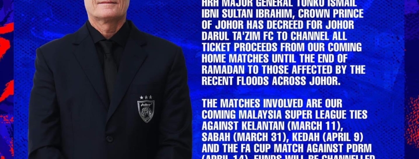 ISKANDAR PUTERI — DYAM Tunku Mahkota Johor, Tunku Ismail Ibni Sultan Ibrahim menitahkan Kelab Bolasepak Johor Darul Ta’zim supaya kesemua hasil jualan tiket perlawanan yang berlangsung di Stadium Sultan Ibrahim disalurkan kepada mangsa banjir di Johor.