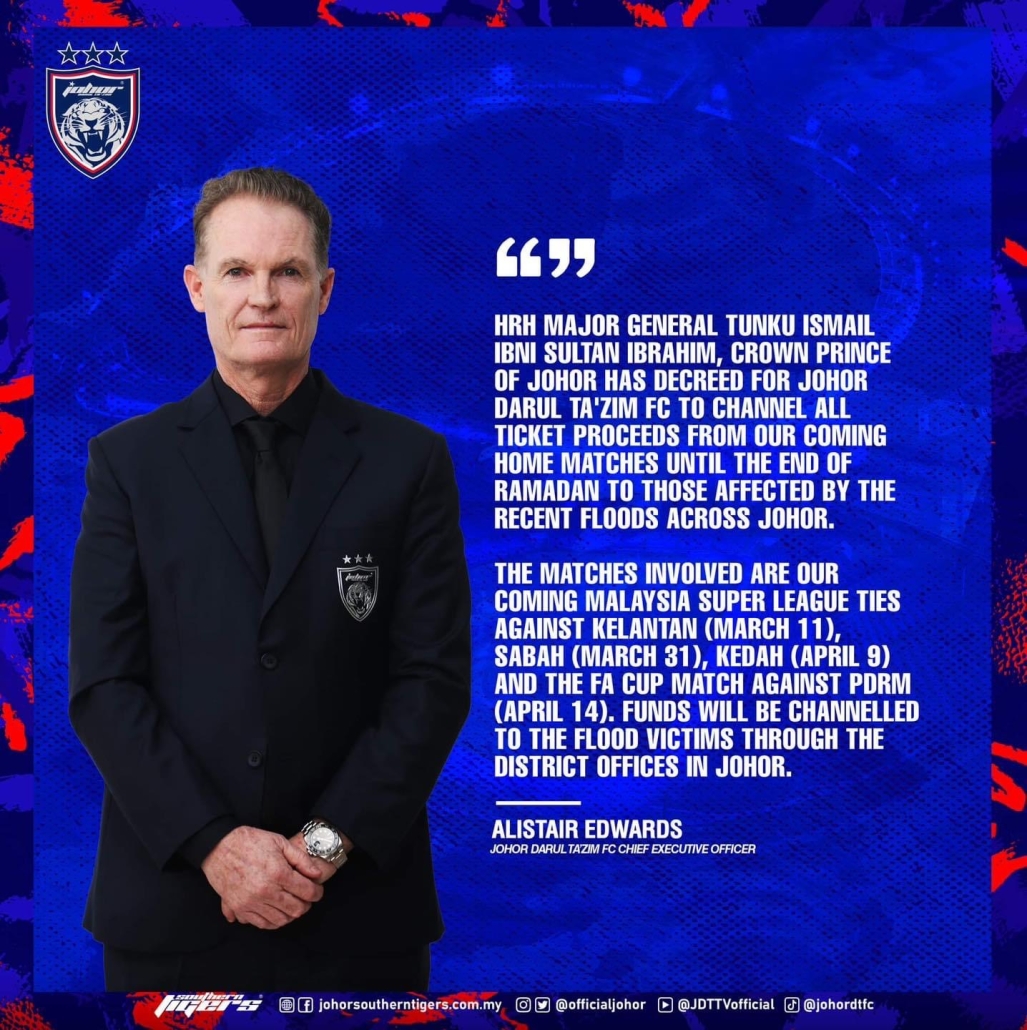 Ketua Pegawai Eksekutif Kelab Bolasepak Johor Darul Ta’zim, Alistair Edwards menjunjung titah DYAM Tunku Ismail agar hasil jualan tiket JDT sepanjang Ramadan disalurkan kepada mangsa banjir Johor. | Gambar Ihsan JOHOR Southern Tigers.
