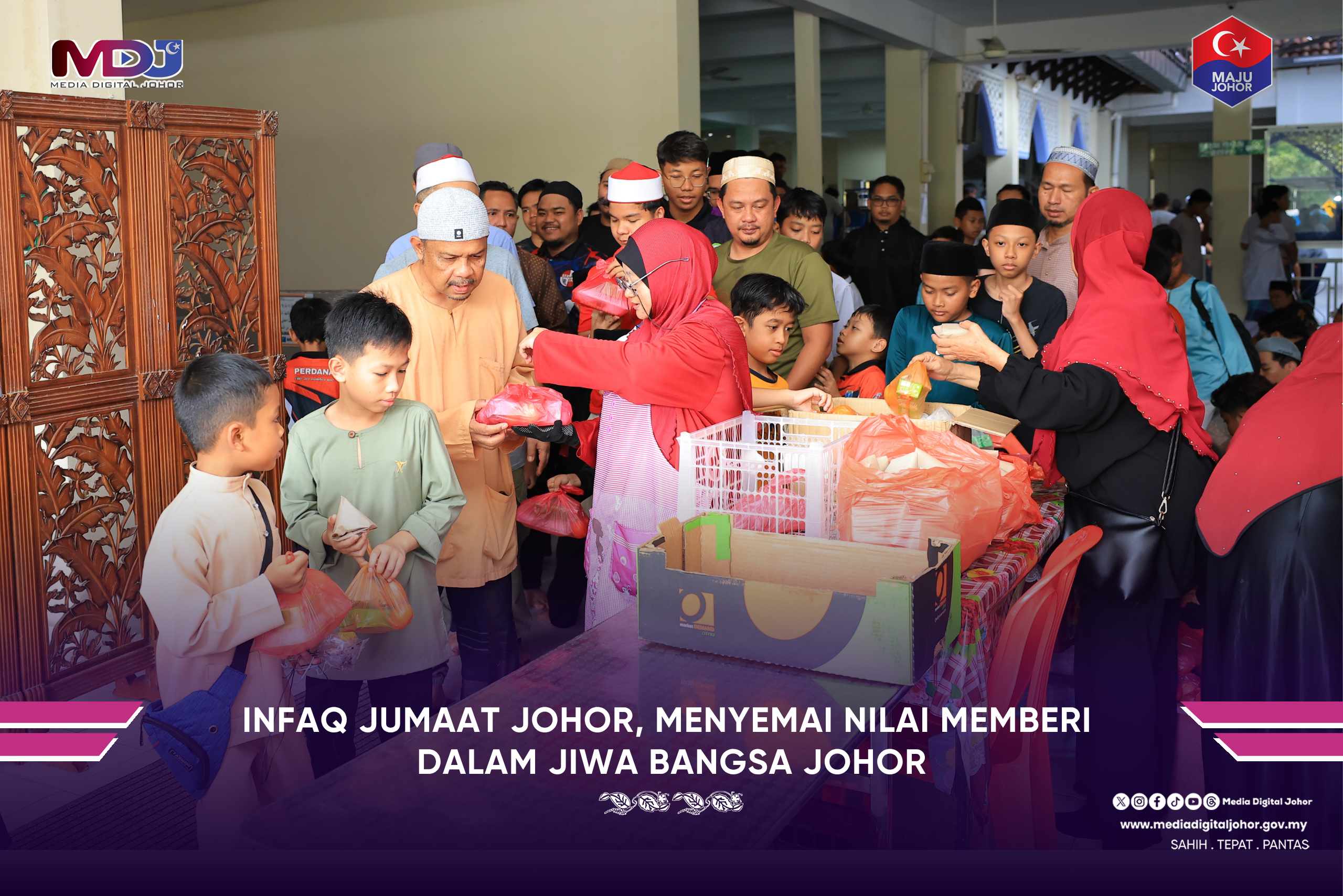2. Di Johor, semangat ini terus disuburkan melalui pelaksanaan Program Infaq Jumaat Johor yang kini menjadi antara inisiatif signifikan dalam memperkukuh syiar Islam serta menyemai budaya kebajikan dalam kalangan masyarakat, khususnya umat Islam di negeri ini.