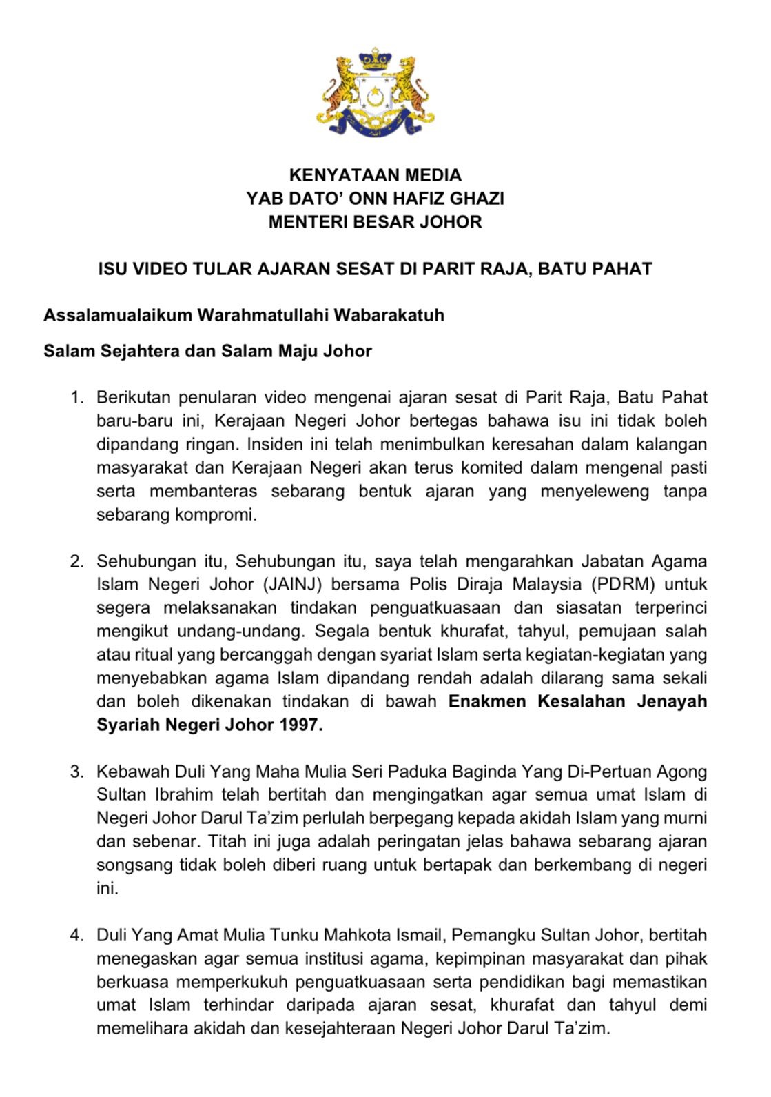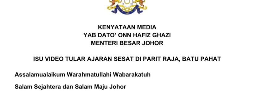 Jabatan Agama Islam Negeri Johor (JAINJ) bersama Polis Diraja Malaysia (PDRM) telah diarahkan untuk segera melaksanakan tindakan penguatkuasaan dan siasatan terperinci mengikut undang-undang, jelas YAB Dato’ Onn Hafiz Ghazi, Menteri Besar Johor.