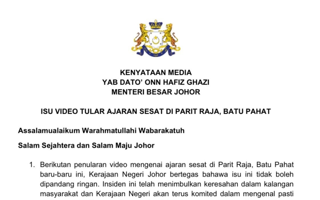 Jabatan Agama Islam Negeri Johor (JAINJ) bersama Polis Diraja Malaysia (PDRM) telah diarahkan untuk segera melaksanakan tindakan penguatkuasaan dan siasatan terperinci mengikut undang-undang, jelas YAB Dato’ Onn Hafiz Ghazi, Menteri Besar Johor.