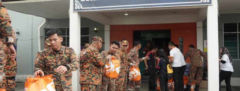 Jabatan Bomba dan Penyelamat Malaysia (JBPM) Negeri Johor dan Syarikat 99Speedmart Sdn. Bhd. mengagihkan beg makanan kepada mangsa banjir di 24 Pusat Pemindahan Sementara (PPS) di Daerah Kota Tinggi. | Foto Jabatan Bomba dan Penyelamat Malaysia (JBPM) Negeri Johor