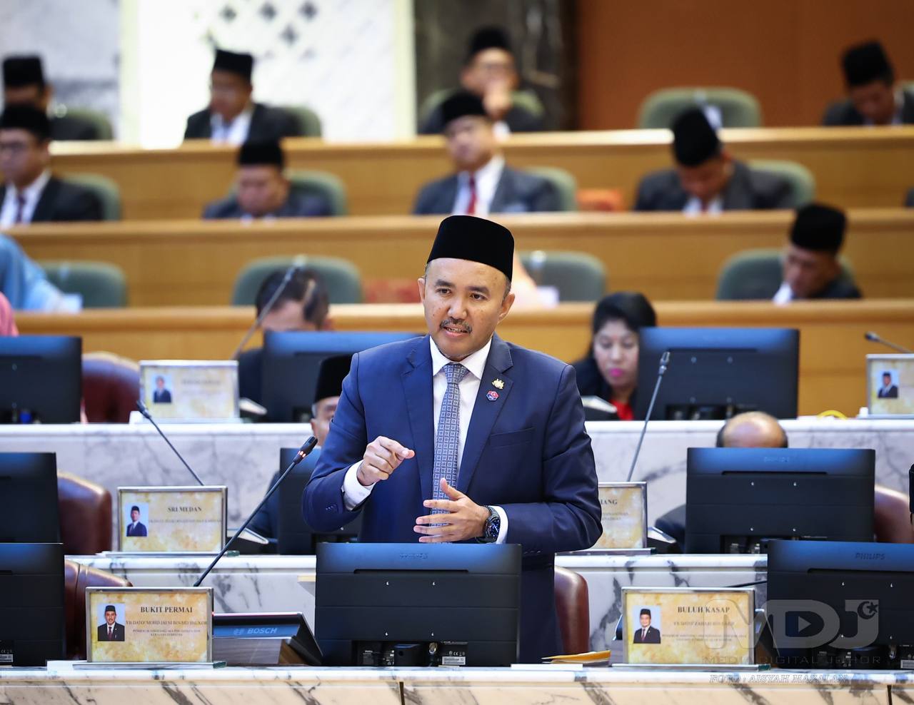 YB Dato’ Mohd Jafni Md Shukor, Pengerusi Jawatankuasa Perumahan dan Kerajaan Tempatan Negeri Johor ketika ucapan penggulungannya pada Mesyuarat Ketiga (Belanjawan 2025) Penggal Persidangan Ketiga Dewan Negeri Johor Ke-15 di Kota Iskandar. | Foto MDJ Aisyah Mazalan