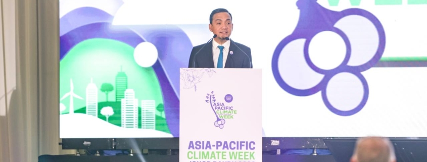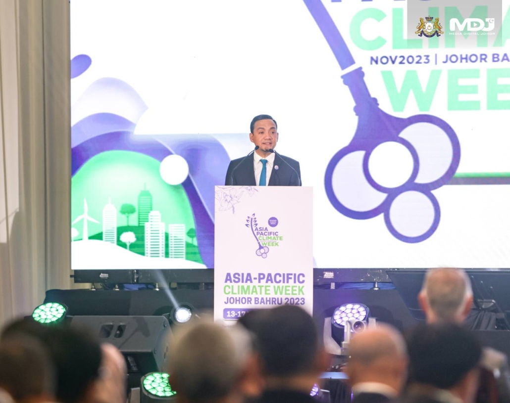 Menteri Besar, Datuk Onn Hafiz Ghazi semasa berucap di Persidangan Minggu Iklim Asia Pasifik 2023 (APCW 2023), hari ini. | Foto MDJ Wira Anggara