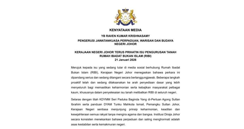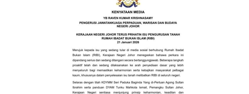#IskandarPuteri – Kerajaan Negeri memandang serius isu pengurusan tanah Rumah Ibadat Bukan Islam (RIBI) yang tular di media sosial dan menzahirkan komitmen untuk menanganinya secara bertanggungjawab melalui penubuhan Taskforce Hal Ehwal Masyarakat Bukan Islam.