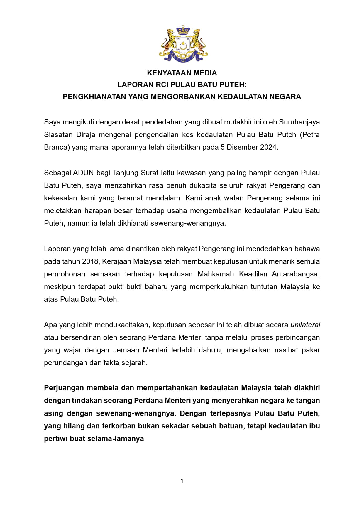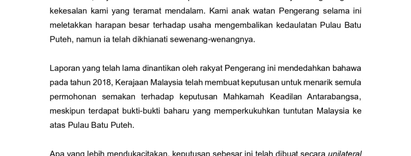 Keputusan yang dibuat itu bukan sahaja mengabaikan fakta sejarah, nasihat pakar perundangan dan bukti baharu yang kukuh, tetapi juga mengkhianati harapan rakyat Malaysia, khususnya warga Pengerang yang selama ini mendambakan kedaulatan Pulau Batu Puteh dapat dikembalikan semula kepada Malaysia, khususnya Negeri Johor.