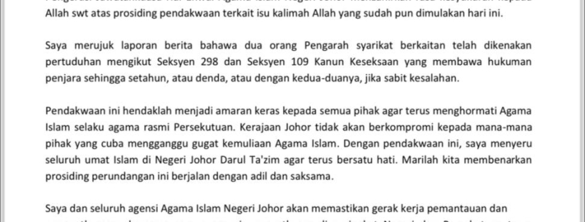 YB Mohd Fared Mohd Khalid, Pengerusi Jawatankuasa Hal Ehwal Agama Islam Negeri Johor menjunjung titah Duli Yang Amat Mulia Tunku Mahkota Ismail, Pemangku Sultan Johor, seterusnya menzahirkan kesyukuran atas prosiding pendakwaan terkait isu kalimah Allah dan memohon aktiviti atau kegiatan membawa persendaan agama Islam dilaporkan kepada pihak berkuasa untuk tindakan tegas diambil serta merta.