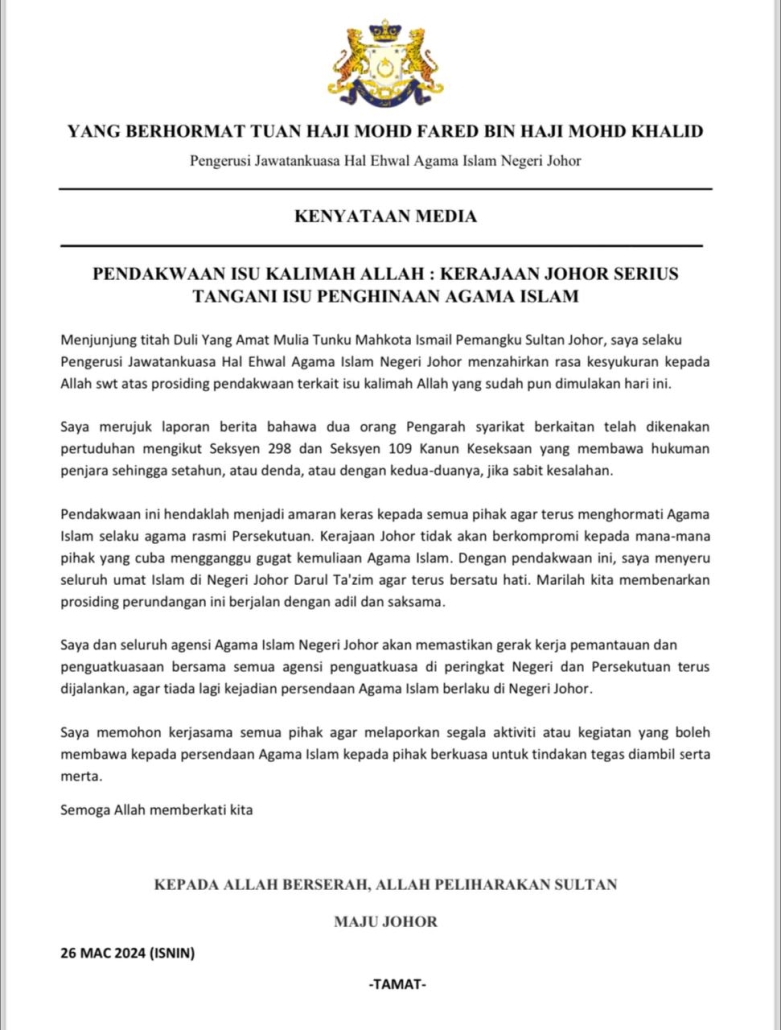 YB Mohd Fared Mohd Khalid, Pengerusi Jawatankuasa Hal Ehwal Agama Islam Negeri Johor menjunjung titah Duli Yang Amat Mulia Tunku Mahkota Ismail, Pemangku Sultan Johor, seterusnya menzahirkan kesyukuran atas prosiding pendakwaan terkait isu kalimah Allah dan memohon aktiviti atau kegiatan membawa persendaan agama Islam dilaporkan kepada pihak berkuasa untuk tindakan tegas diambil serta merta.