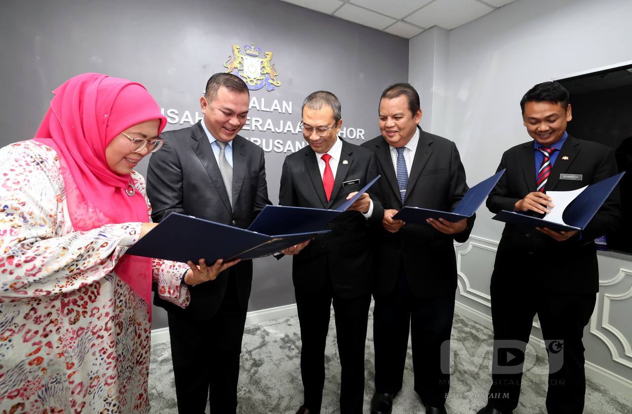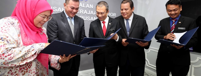Turut menurunkan tandatangan, YBhg. Puan Tazrina Ahmad, Pengarah Media Digital Johor; YBhg. Encik Sharifulizan Sharifudin, Setiausaha Bahagian ICT@Johor dan YBhg. Encik Khirul Nizam Mat Said, Pengarah Jabatan Landskap Negeri Johor.