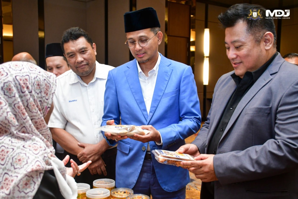 YB Mohd Fared Mohd Khalid, Pengerusi Jawatankuasa Hal Ehwal Agama Islam Negeri Johor (tengah) beramah mesra dengan usahawan tajaan MAINJ dan SIRIM. | Foto MDJ Dania Farisya