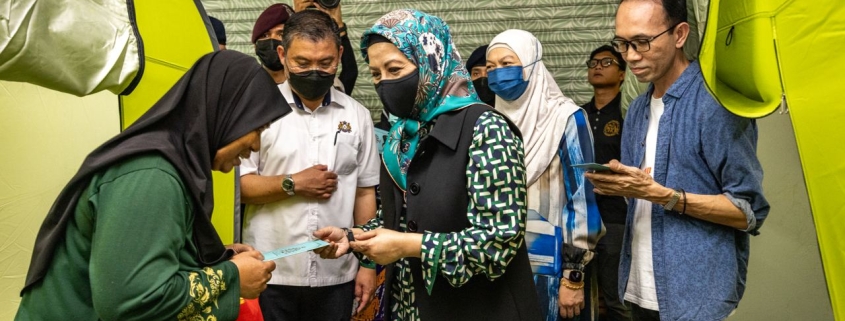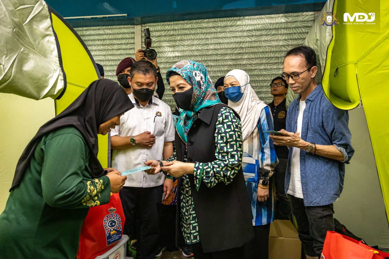 Permaisuri Johor, DYMM Raja Zarith Sofiah Binti Almarhum Sultan Idris Shah memberi sumbangan kepada mangsa terjejas banjir melalui Yayasan Raja Zarith Sofiah Negeri Johor (YRZSNJ) di Pusat Pemindahan Daerah (PPS) Daerah Kota Tinggi. | Foto MDJ Nurina Aisyah.