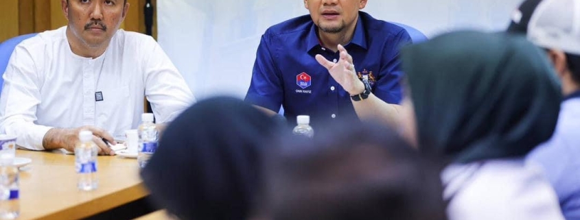 Menteri Besar Johor, Datuk Onn Hafiz Ghazi, ketika mengetuai mesyuarat khas bersama agensi-agensi berkaitan di Bilik Gerakan Bencana Johor. | Sumber foto: Facebook Onn Hafiz Ghazi.