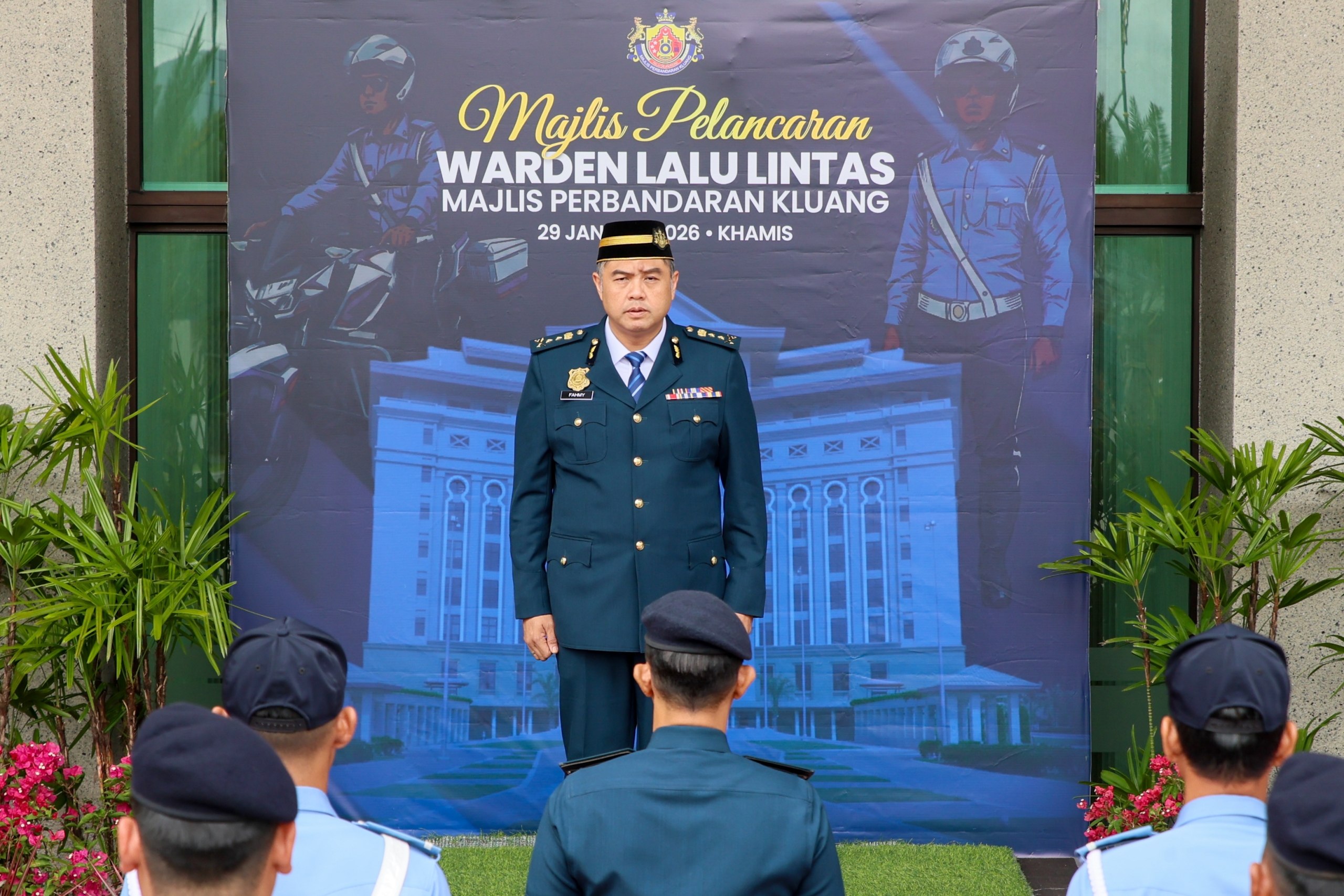 Terdahulu, YBhg. Encik Mohd Fahmy Yahya, Yang Dipertua MPK hadir menyempurnakan Majlis Pelancaran Warden Lalu Lintas Majlis Perbandaran Kluang di Perkarangan MPK, hari ini.