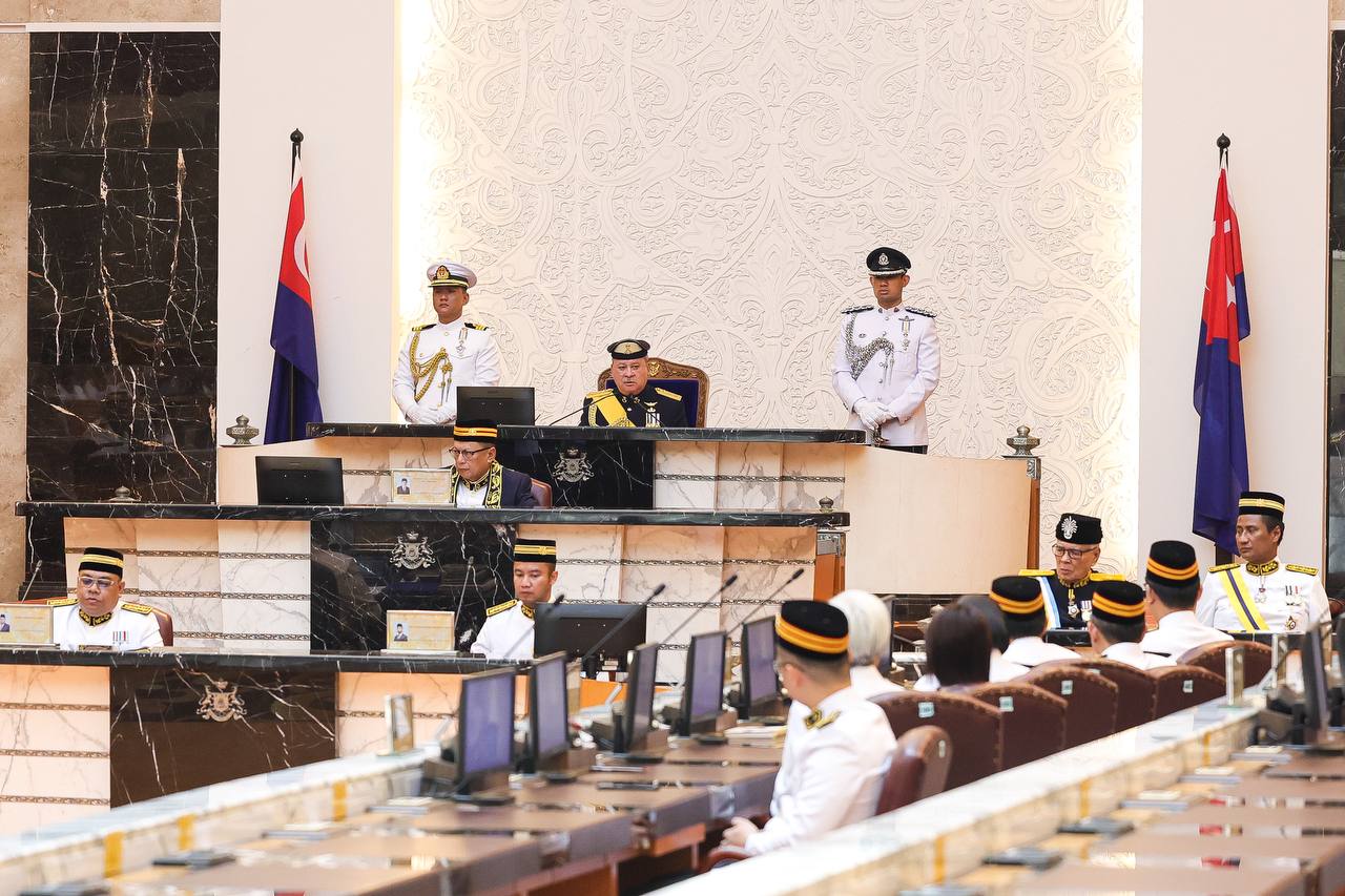 DYMM Sultan Johor, Sultan Ibrahim Ibni Almarhum Sultan Iskandar, bertitah Kerajaan Persekutuan menyalurkan peruntukkan khas pasca banjir kepada Johor dalam Mesyuarat Pertama (Pembukaan Rasmi) Bagi Penggal Persidangan Kedua Dewan Negeri Johor Yang Ke-15 di Bangunan Sultan Ismail, Kota Iskandar, hari ini / Sumber Foto MedKom.