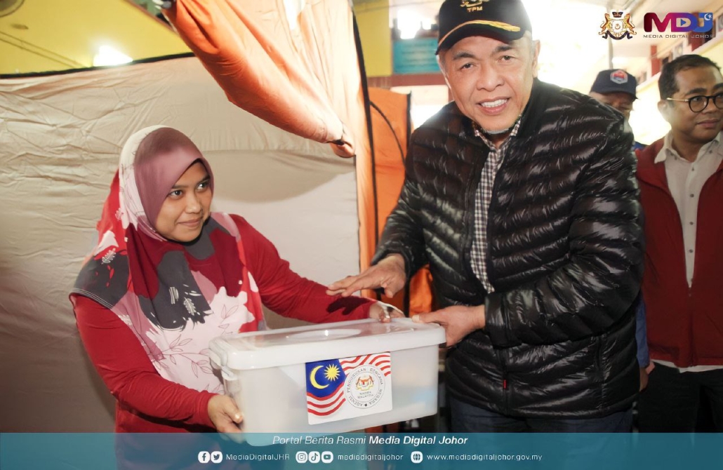 Timbalan Perdana Menteri 1, Datuk Seri Dr Ahmad Zahid Hamidi (kanan) menyampaikan bantuan kepada mangsa banjir yang sedang berlindung di pusat pemindahan sementara (PPS) di Kota Tinggi / Gambar MDJ Nurul Asyiqin Jalil.