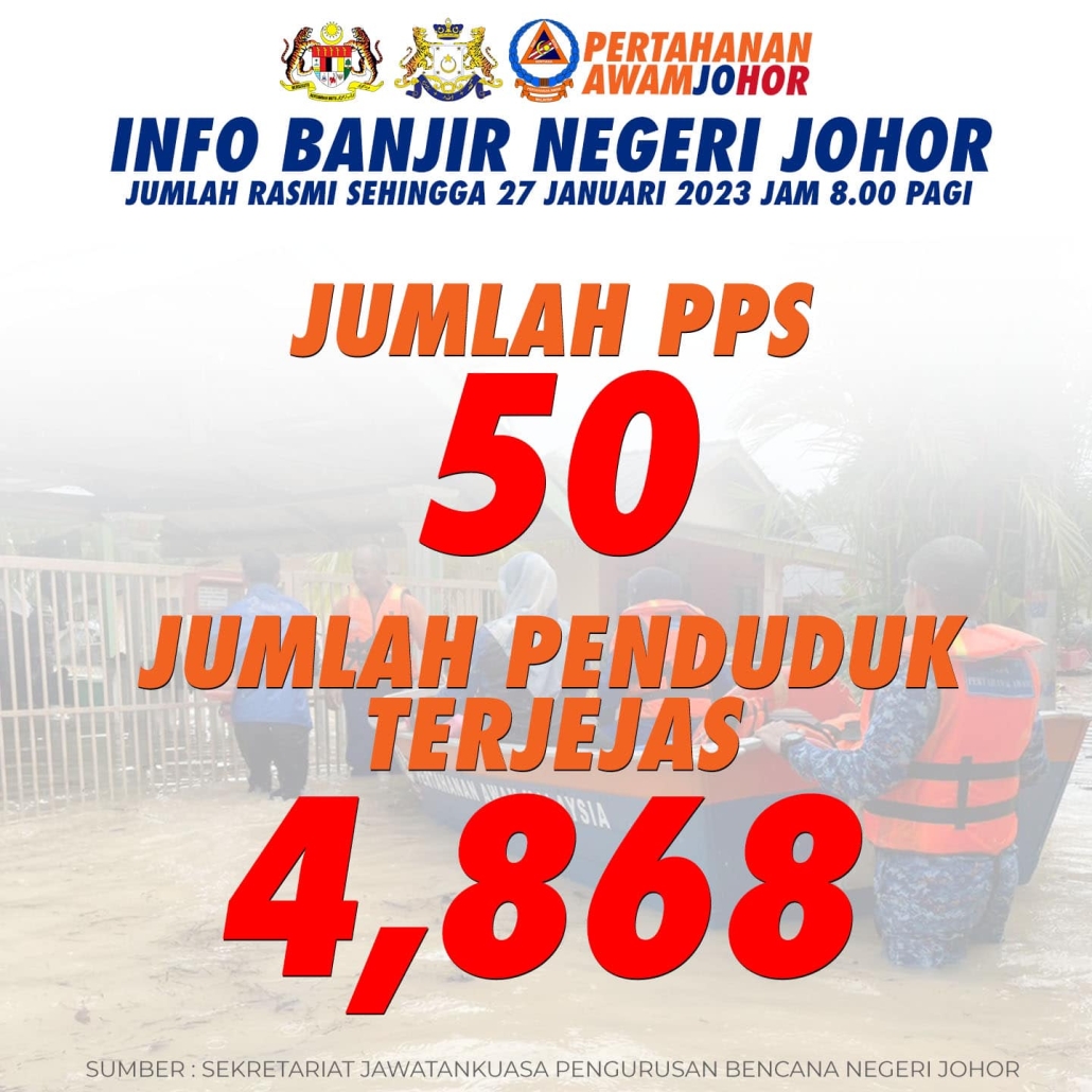 Daerah Segamat, Mersing dan Kota Tinggi merekodkan 11 PPS beroperasi bagi memberikan perlindungan kepada mangsa banjir diikuti Kluang (7), Batu Pahat (6), Muar (2), Tangkak dan Pontian (1).