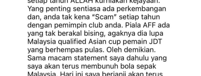“Oleh demikian, sama macam ‘statement’ saya dahulu yang saya akan terus membunuh bola sepak Malaysia,” titahnya.