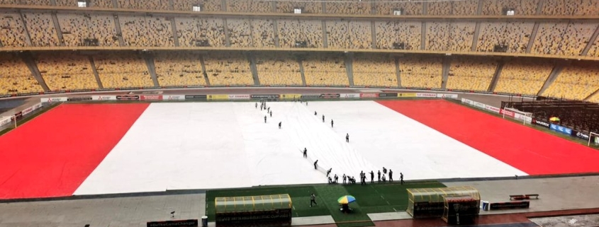 Terdahulu, Hannah dalam ciapan melalui akaun Twitternya memberitahu Perbadanan Stadium Malaysia telah membeli kanvas baru bagi menutup permukaan padang SNBJ semasa hujan.
