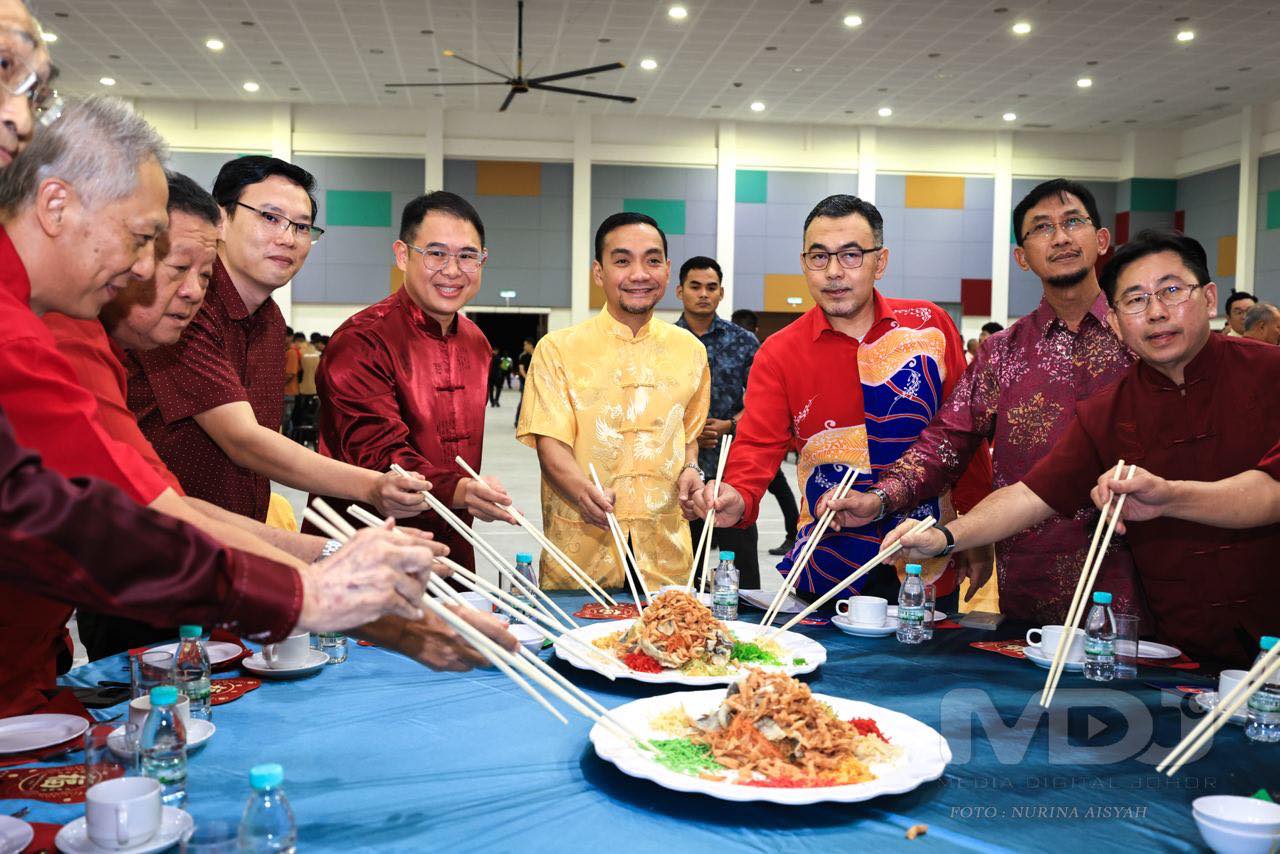 YAB Dato’ Onn Hafiz Ghazi, diiringi YB Tuan Ling Tian Soon, Pengerusi Jawatankuasa Kesihatan dan Alam Sekitar Negeri Johor dan YB Tuan Lee Ting Han, Pengerusi Jawatankuasa Pelaburan, Perdagangan, Hal Ehwal Pengguna dan Sumber Manusia Negeri Johor meraikan kira-kira 1,000 masyarakat Tiong Hua dari seluruh Johor pada Majlis Jamuan Silaturahim Tahun Baharu Cina. | Foto MDJ Nurina Aisyah