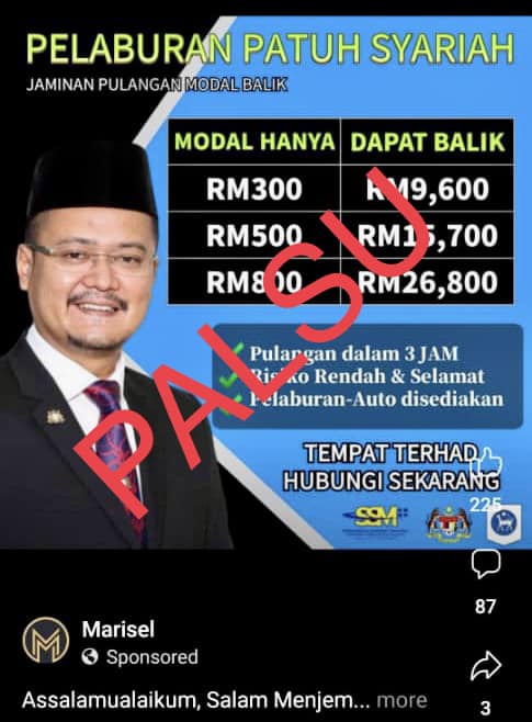 Beliau akui menerima banyak mesej dan pertanyaan menerusi media sosial dan aplikasi pesanan, berhubung iklan berbayar yang menggunakan poster gambarnya bertajuk ‘Pelaburan Patuh Syariah’, baru-baru ini.