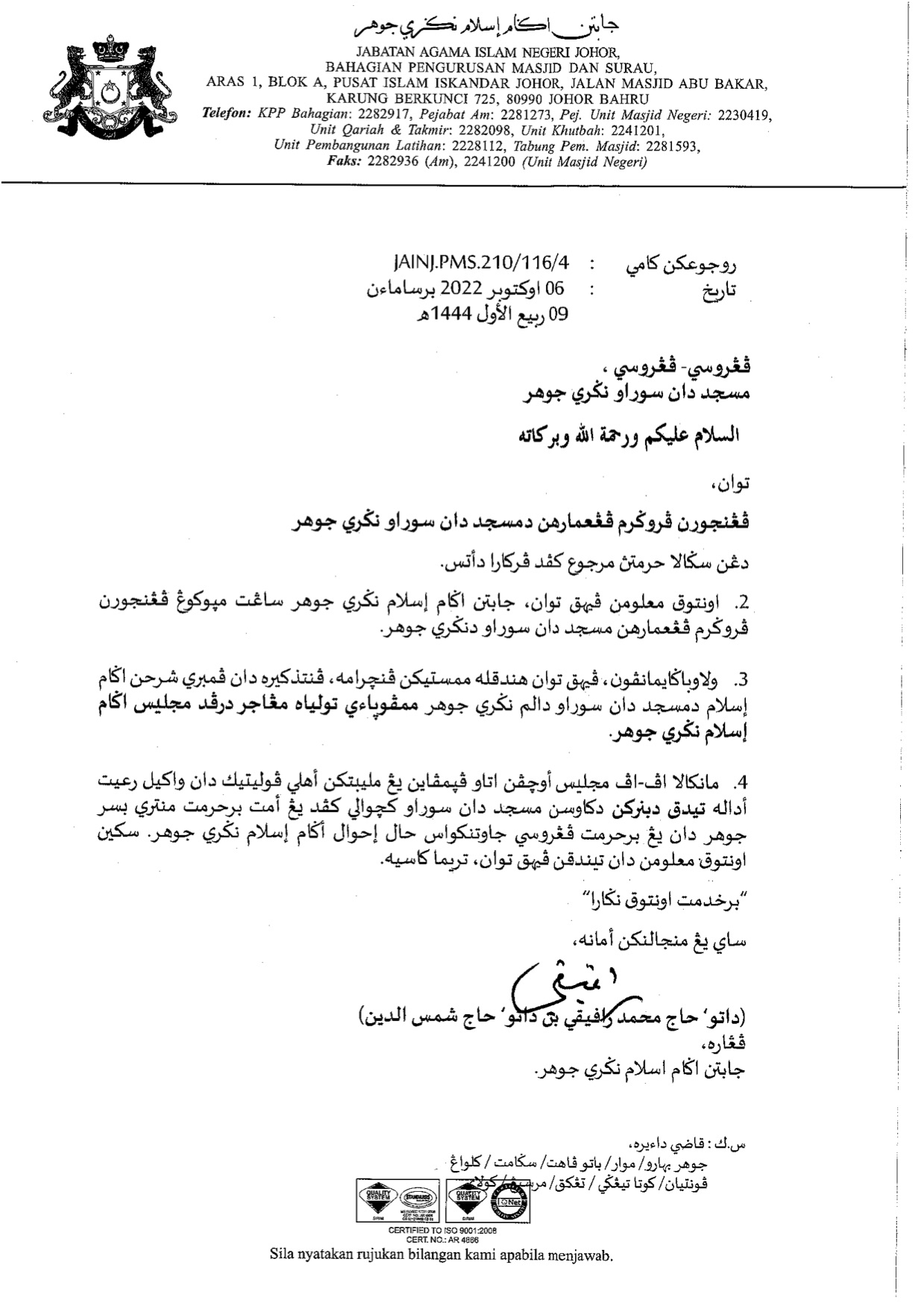 Bagaimanapun, masjid dan surau hendaklah memastikan penceramah, pentazkirah dan pemberi syarahan mempunyai tauliah mengajar daripada Majlis Agama Islam Negeri Johor.