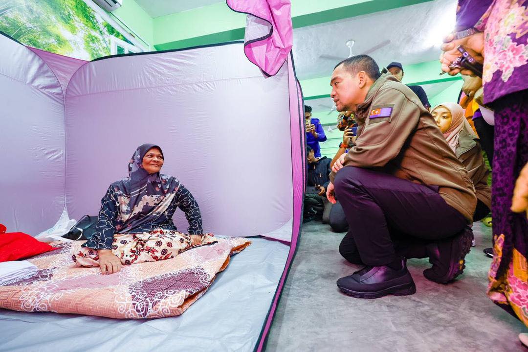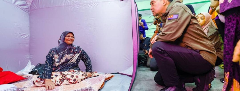 YAB Dato’ Onn Hafiz Ghazi, Menteri Besar Johor menyantuni mangsa-mangsa banjir di Pusat Pemindahan Sementara (PPS) Sekolah Kebangsaan (SK) Bukit Mutiara, Johor Bahru. | Foto ihsan MEDKOM