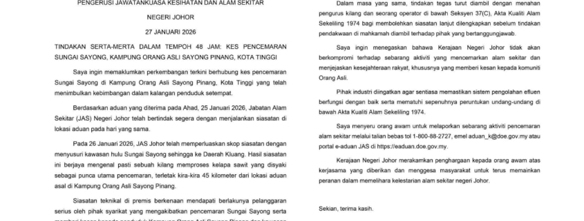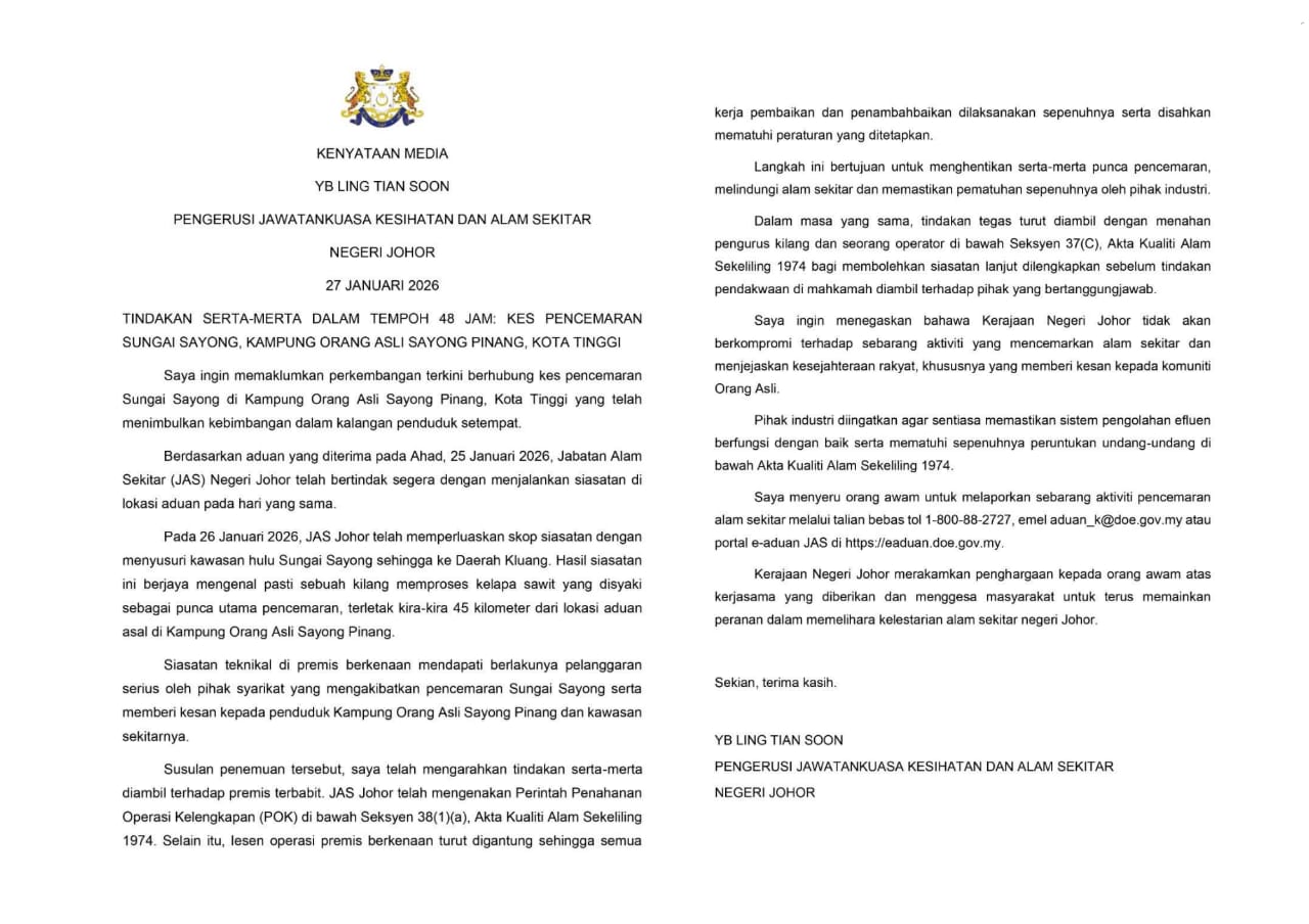Kerajaan Johor menerusi Jabatan Alam Sekitar (JAS) Johor telah bertindak pantas bagi mengenal pasti punca pencemaran Sungai Sayong di Kampung Orang Asli Sayong Pinang, Kota Tinggi dalam tempoh kurang 48 jam susulan daripada aduan awam yang diterima pada 25 Januari lalu. | Kenyataan Media Tuan YB Ling Tian Soon
