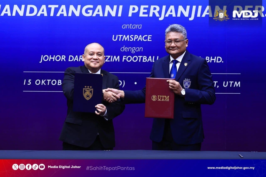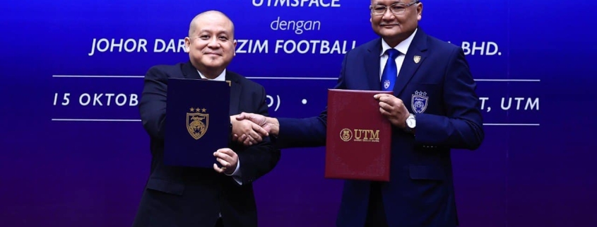Majlis perjanjian persefahaman antara Universiti Teknologi Malaysia (UTM) melalui UTMSPACE dengan JDT FC telah disempurnakan oleh Ketua Pegawai Eksekutif dan Pengarah Urusan UTMSPACE, Profesor Ts Dr. Nazri Ali dan Pemangku Pengurus Besar JDT FC, Dato’ Haji Salehuddin Haji Hassan.