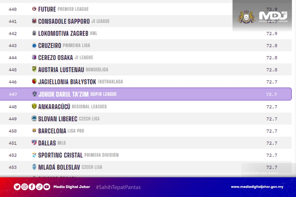 “JDT menunjukkan peningkatan dalam ranking kelab bola sepak dunia dengan kini berada di tangga ke-447 Dunia, ke-31 Asia dan kedua Asean mengikut data yang dikeluarkan laman Opta Analyst.