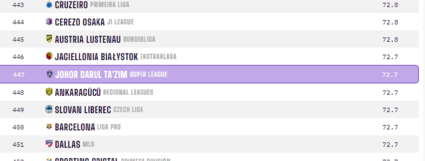 “Tiada pasukan lain dari Malaysia yang berada dalam kedudukan 500 teratas, malah pasukan lain Liga Malaysia berada di tempat 2,148 dan ke bawah,” jelas kenyataan sama.
