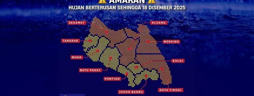#IskandarPuteri – Negeri Johor kini berada dalam situasi Amaran Hujan Berterusan yang dijangka berlarutan sehingga 18 Disember 2025, menurut laporan terkini daripada Jabatan Meteorologi Malaysia (MET Malaysia), melibatkan dua tahap amaran iaitu Tahap Buruk dan Tahap Waspada.