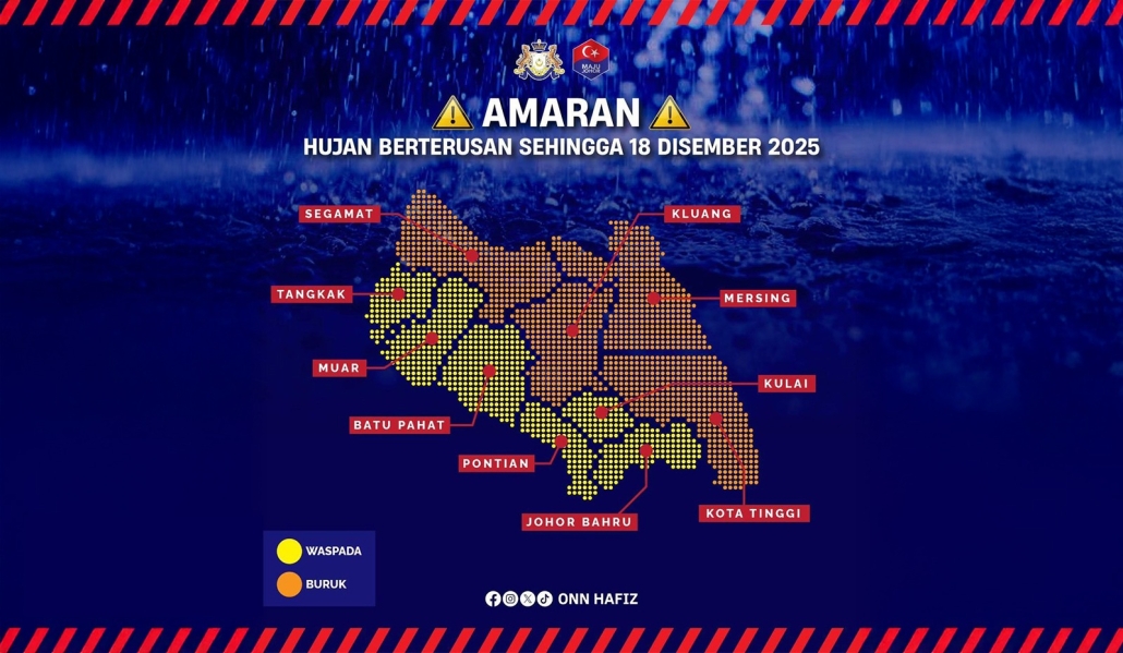 #IskandarPuteri – Negeri Johor kini berada dalam situasi Amaran Hujan Berterusan yang dijangka berlarutan sehingga 18 Disember 2025, menurut laporan terkini daripada Jabatan Meteorologi Malaysia (MET Malaysia), melibatkan dua tahap amaran iaitu Tahap Buruk dan Tahap Waspada.