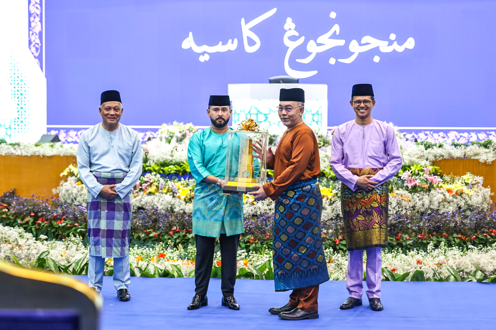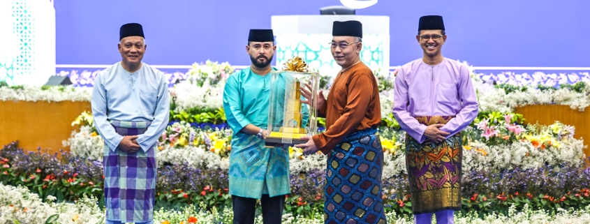 DYAM Tunku Mahkota Ismail, Pemangku Sultan Johor berkenan menyampaikan trofi kepada YBhg. Tuan Masni Wakiman, Pegawai Daerah Johor Bahru selepas daerah tersebut dinobatkan johan keseluruhan Majlis Tilawah Al-Quran Ke-70 Negeri Johor. | Foto MDJ Nurina Aisyah