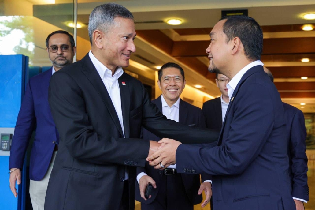 Menteri Besar Johor, Datuk Onn Hafiz Ghazi mengadakan perbincangan bersama Menteri Ehwal Luar Singapura, Dr. Vivian Balakrishnan serta Menteri di Jabatan Perdana Menteri merangkap Menteri Kedua Ehwal Luar Singapura, Dr. Mohamad Maliki Osman | Sumber gambar Facebook Onn Hafiz Ghazi.
