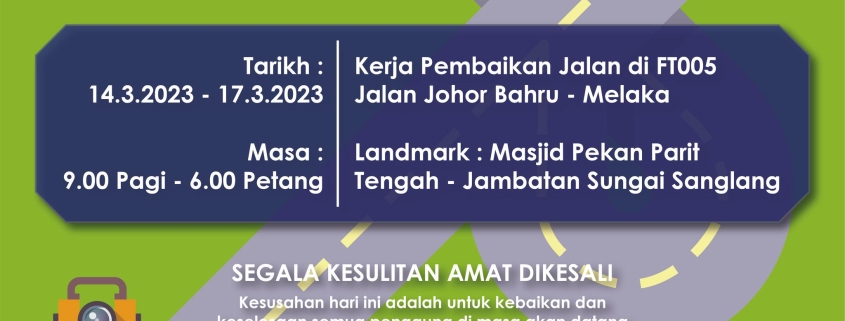 “Kerja pembaikan jalan di FT005 Jalan Johor Bahru – Melaka akan ditutup untuk satu lorong sepanjang tiga kilometer selama empat hari bermula 14 Mac 2023 sehingga 17 Mac 2023,” kata beliau lagi.